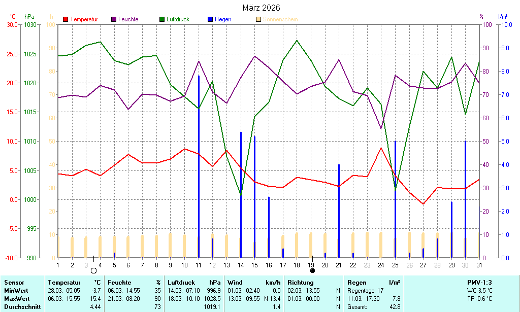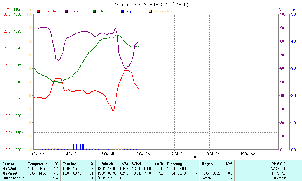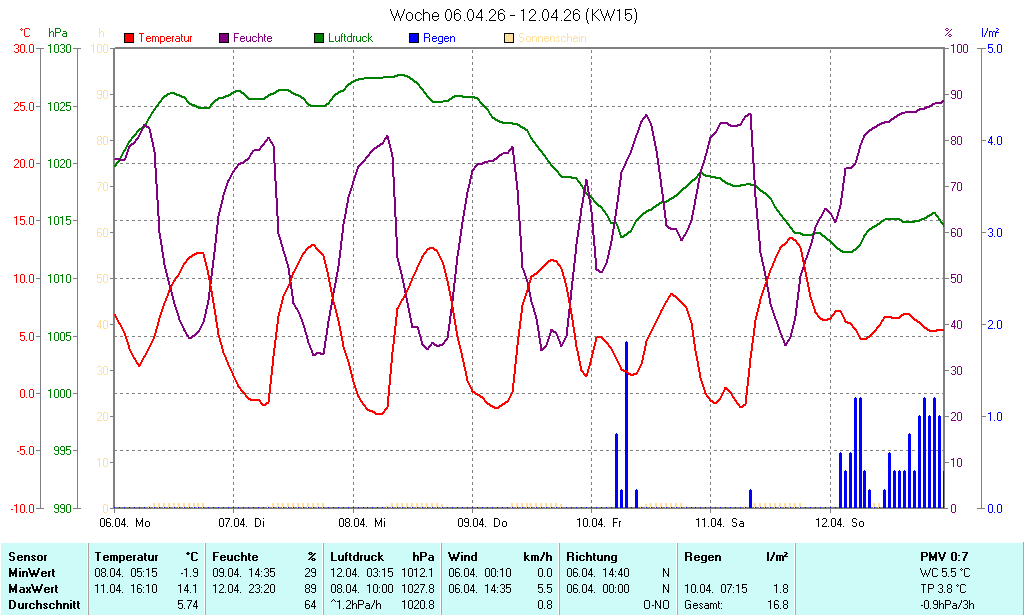 | Die dargestellten Werte repräsentieren die Daten der letzten 24 Stunden! Der Luftdruck ist auf Meereshöhe bezogen! |